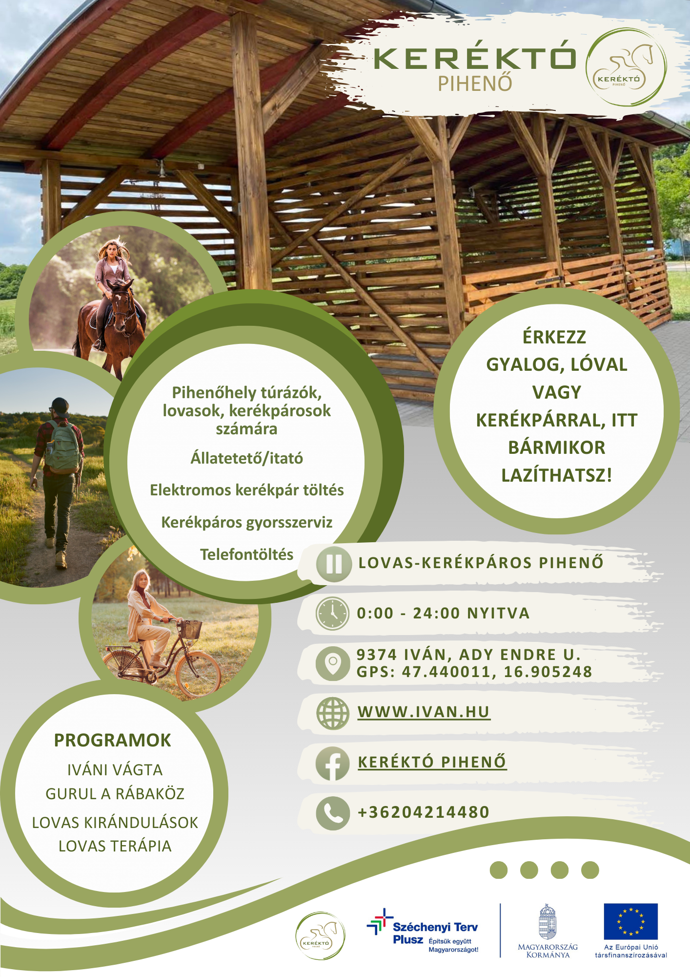 Az Iván Községi Önkormányzat a Széchenyi Terv Plusz program Helyi és térségi turizmusfejlesztés című pályázati felhívás keretében 15.898.348,- Ft vissza nem térítendő Európai Uniós támogatást nyert. A Helyi és térségi turizmusfejlesztés Iván községben c. projekt megvalósítása lehetővé tette, hogy kialakítsunk egy olyan pihenőt, ahol a különböző jármódok közötti váltás, és a közösségek találkozása is biztosított.